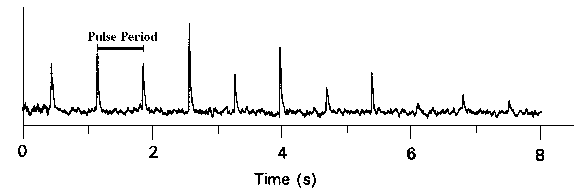 The period of a pulsar is the time between pulses it emits. Periods are typically a few seconds long and are very regular. However, periods usually get longer over long periods of time, as the pulsar loses energy and begins to slow down.